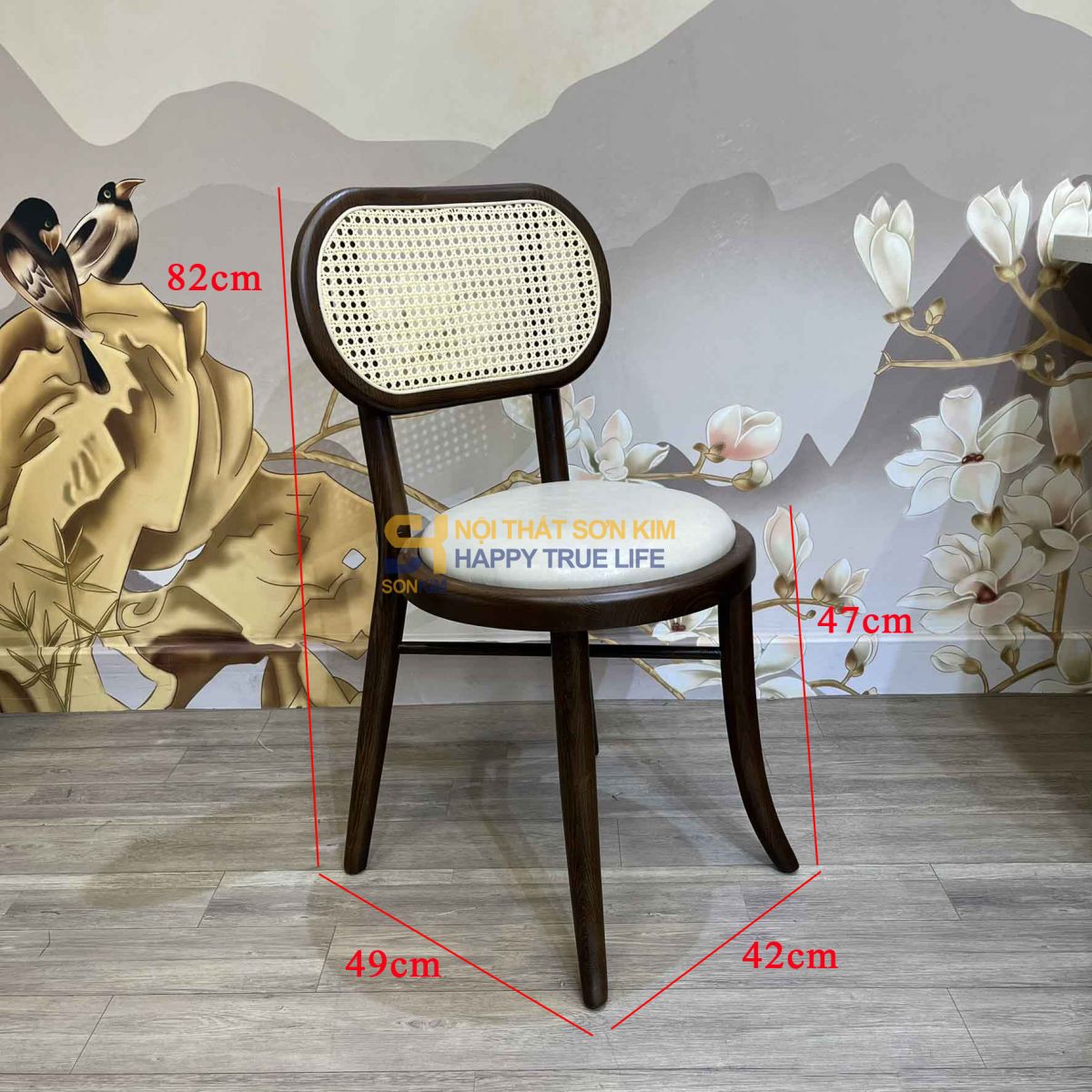 Lưng ghế mây đan mắt cáo, kết hợp khung gỗ tần bì sơn nâu, vừa thoáng mát, vừa tinh tế.