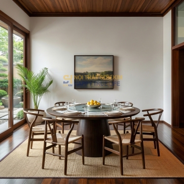 Bộ bàn tròn phòng VIP và ghế Whisbone đan dây BGA85 từ Nội Thất Sơn Kim là lựa chọn hoàn hảo dành cho những không gian sang trọng, đặc biệt là khu vực phòng VIP trong nhà hàng, khách sạn cao cấp hoặc phòng ăn gia đình đẳng cấp. Với thiết kế độc đáo và tinh tế, bộ sản phẩm này mang lại cảm giác đẳng cấp và đầy nghệ thuật, tạo nên điểm nhấn đặc biệt cho bất kỳ không gian nào. Bàn gỗ tần bì với mặt tròn kích thước D160cm, kết hợp khung bàn gỗ ash chắc chắn, mặt đá ceramic ngọc lục bảo cao cấp không chỉ đẹp mắt mà còn bền bỉ theo thời gian. Đặc biệt, sự kết hợp giữa mặt đá và đường nét gỗ tiện sắc nét, tỉ mỉ giúp bàn trở thành tâm điểm của bất kỳ không gian nào.