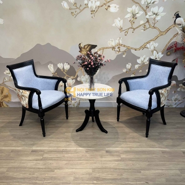Thiết kế: Kiểu dáng cổ điển pha lẫn hiện đại. Tay vịn uốn cong mềm mại, chân tiện chi tiết sắc nét. Mặt sau ghế nổi bật với vải hoa văn cổ điển, tạo điểm nhấn độc đáo đầy nghệ thuật.