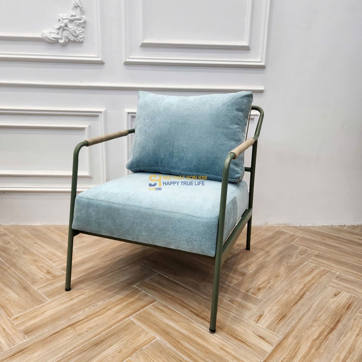 Nệm ngồi và tựa lưng tone xanh da trời dịu mắt, nổi bật và hài hòa với màu khung Mint, tạo nên tổng thể trẻ trung, tinh khiết và dễ phối trong mọi concept décor.