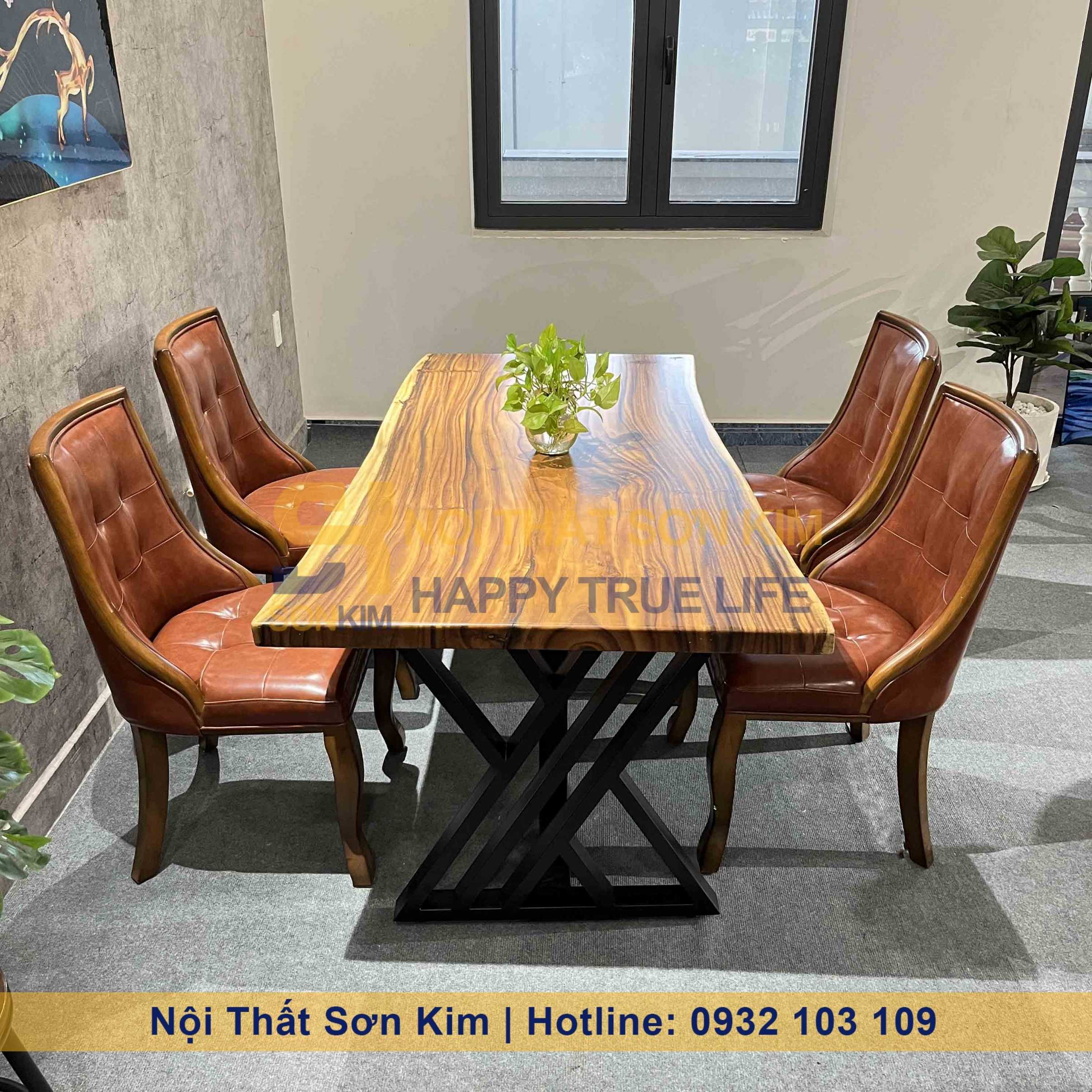 Bàn được làm từ gỗ me tây tự nhiên nguyên tấm, tạo nên vẻ đẹp thuần khiết và tinh tế từ thiên nhiên. Chân bàn sắt sơn tĩnh điện đen là điểm nhấn tinh tế, tạo nên sự đối lập và sang trọng. Ghế gỗ cao su có thể có màu nâu ấm hoặc tự nhiên, nệm bọc simili hoặc vải theo yêu cầu, nệm ngồi và lưng tựa bọc da PU hoặc vải tùy chọn tạo nên sự thoải mái và sang trọng.